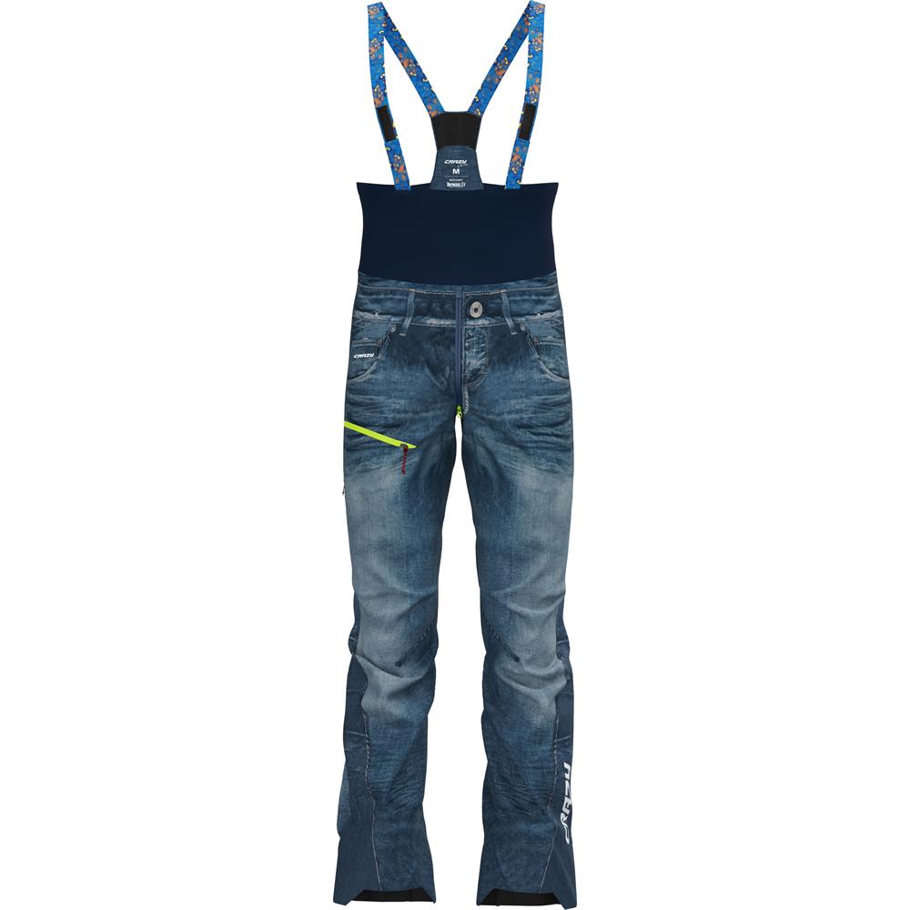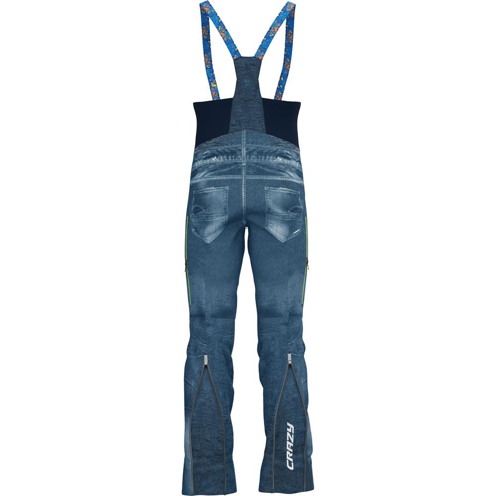 Waterproof trousers for mountaineering, ski mountaineering and ice fall climbing, a real gem in Fast & Light style, featuring a very lightweight bib with minimalist braces that make it quick and easy to wear, comfortable and stable once it is on. We have implemented an innovative fastening system that allows you to keep the braces on even if the trousers are taken off. Definitely the most stretchy, lightweight and packable in the category, designed entirely and pre-shaped for maximum ease of movement. For easy pull-on, the legs feature full-length double-slider side zips - so they can be fully opened. These trousers are constructed with Dermizax Ev, even more durable than the material used for the jackets and come with the iconic denim print. The side pockets can be opened for easy venting. The stretch, reinforced gaiters feature a width adjustment system that makes them easy to wear even over bulky boots or, if fastened.